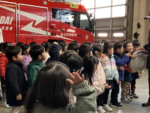 ポンプ車やはしご車、化学車など、様々な種類の消防車の役割を教えていただきました。火を消すためのホースを持たせていただいた子どもたちは、その重さにびっくり!!救急車も間近で見ることができ、消防士さんを憧れのまなざしで見つめていました。