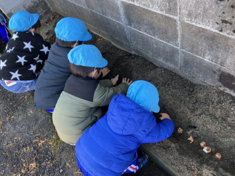 年中組の子どもたちが、園庭と南側駐車場の花壇にチューリップの球根を植えてくれました。球根を受け取ると「かわいい」と優しく見つめていた子どもたち。副園長先生に教えてもらった通りに上向きでそっと置き、土のお布団をかけました。春になってきれいなお花がいっぱい咲くのが楽しみです。